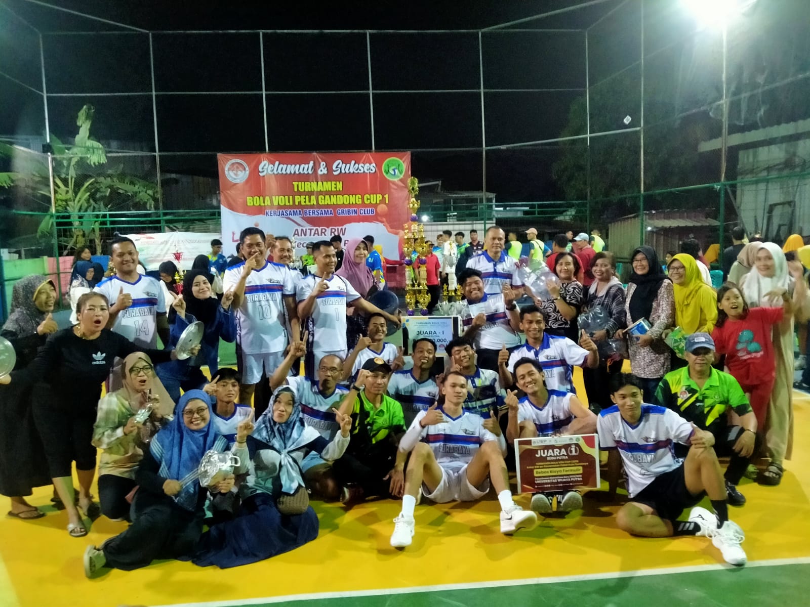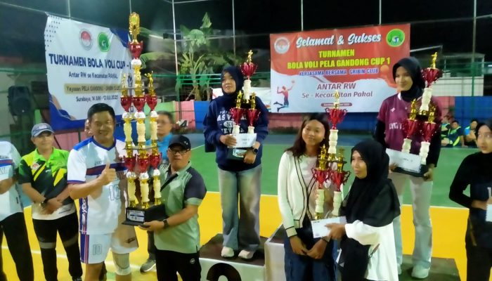 SURABAYA: Berkahir sudah kejuaraan bola voli antar RW di wilayah Kecamatan Pakal, Surabaya, bertajuk Pela Gandong-Gribin Cup I. Tim bola voli Putri RW 12 berhasil meraih juara dan juara sektor putra direbut RW 13 pada babak final yang digelar di Lapangan bola voli PBV Gribin volleyball Club, Kawasan Perumahan Griya Benowo Indah Surabaya Barat, Sabtu (12/7).