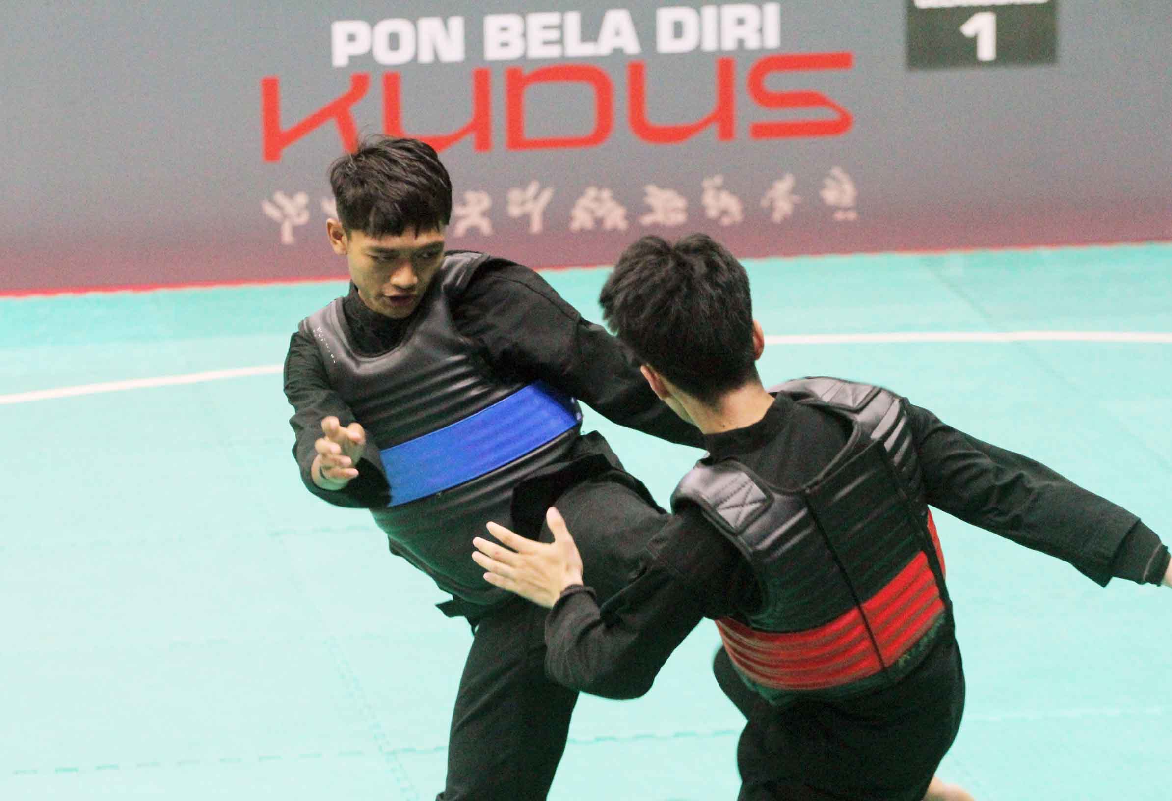 Pesilat Jatim M Ramdani (biru) saat menghadapi pesilat Banten. (tom)