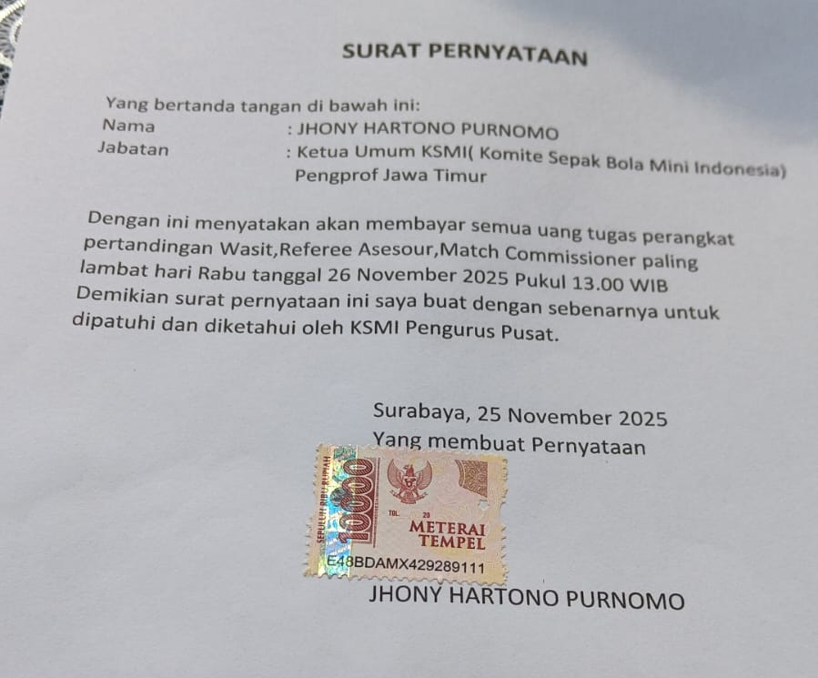 Dalam surat pernyataan yang ditandatangi Johny Hartono itu, tertulis jika dirinya sebagai Ketua KSMI Jatim akan membayar semua uang tugas perangkat pertandingan. Mulai, Wasit, Referee Asesour, Match Commissioner paling lambat hari Rabu (26/112025), pukul 13.00 WIB.