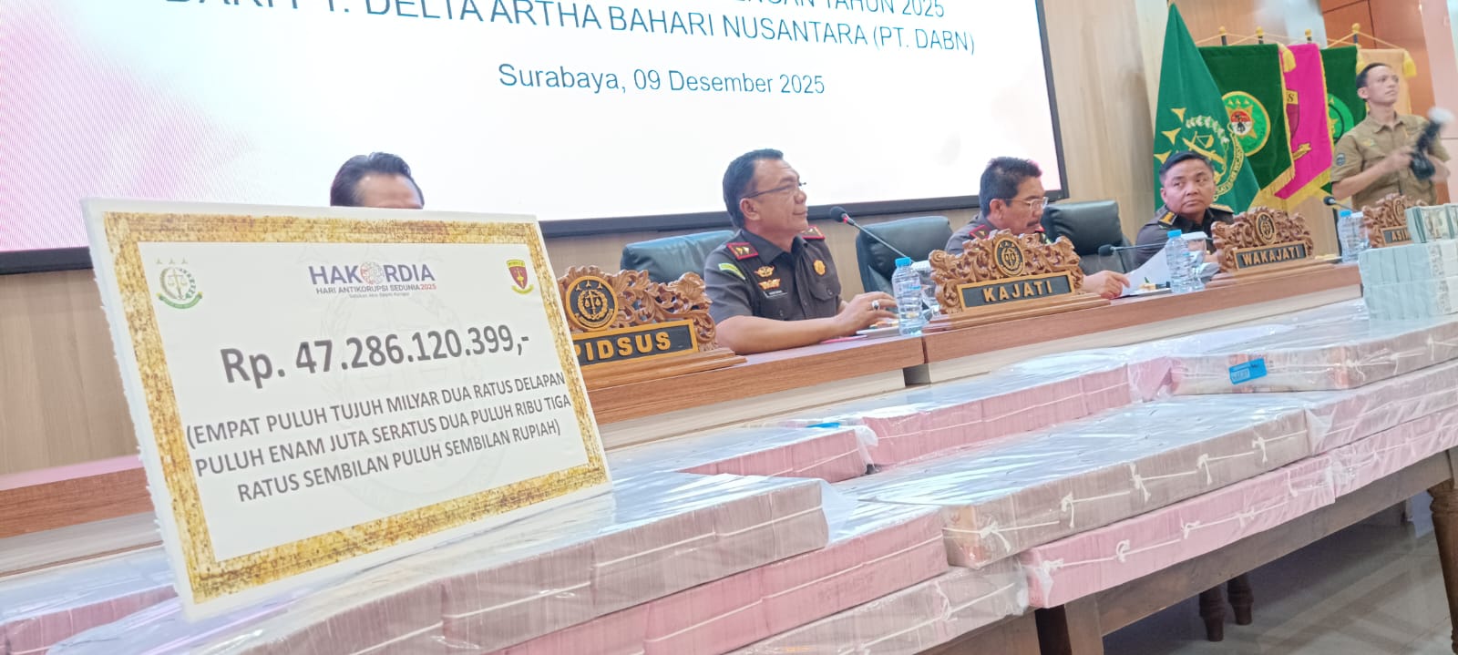 SURABAYA: Bertepatan dengan Peringatan Hari Anti Korupsi Sedunia (Hakordia) 2025, Kejaksaan Tinggi (Kejati) Jawa Timur telah menyita uang senilai Rp47,28 miliar dan USD 421.046 dalam perkara dugaan tindak pidana korupsi pengelolaan kegiatan jasa pelabuhan di Pelabuhan Tanjung Tembaga, Probolinggo, yang dilakukan PT Delta Artha Bahari Nusantara (PT DABN) sejak tahun 2017 hingga 2025.